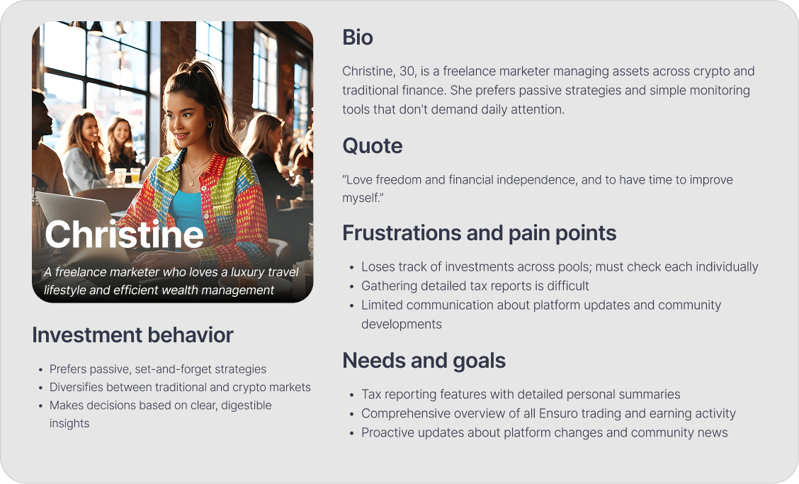 This solo project maintained the original design while adding a new feature to the Ensuro website: a user portfolio dashboard. From identifying the problem to UX research, visual design, and prototyping, my experience as an Ensuro user informed the design decisions.