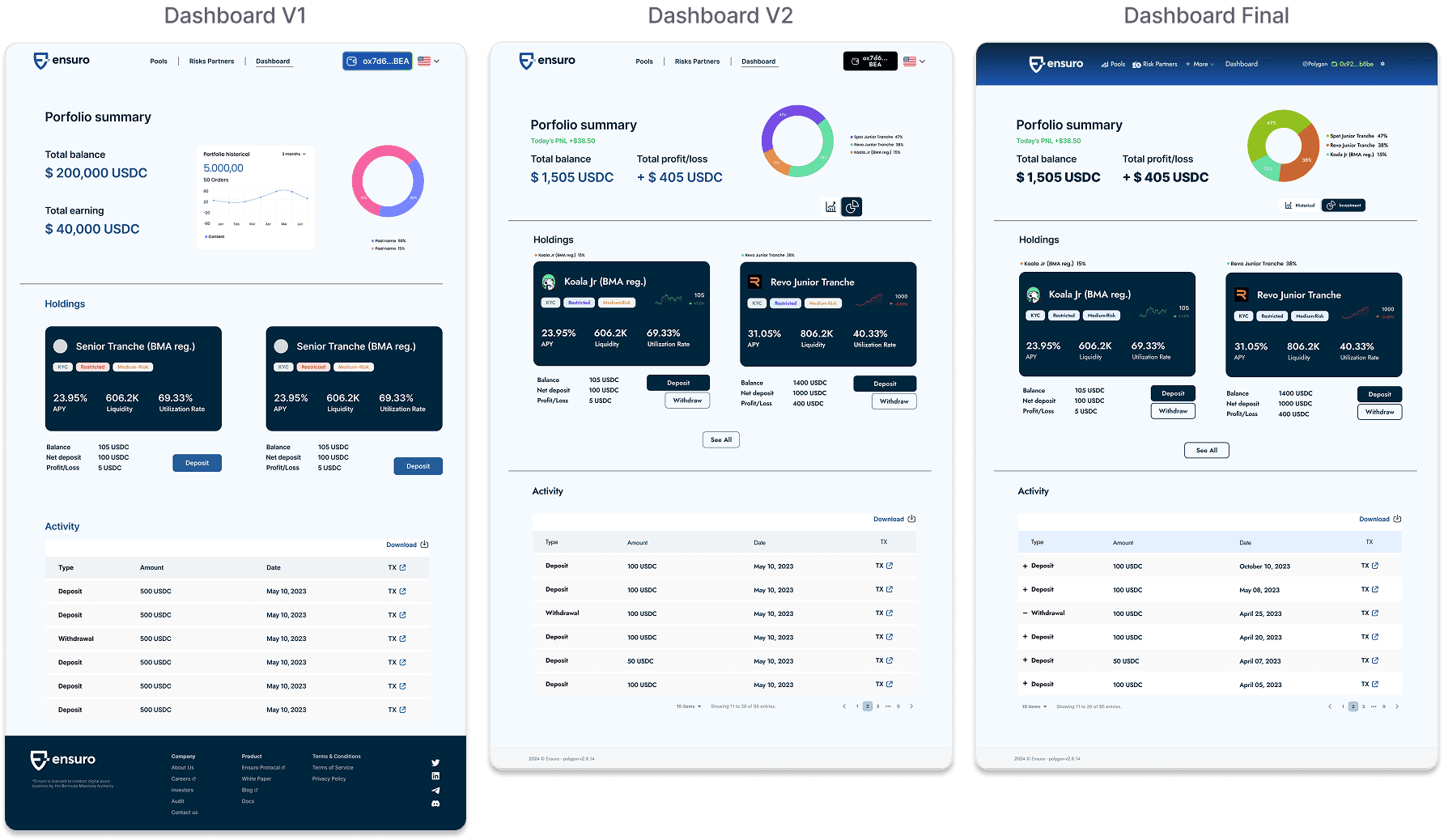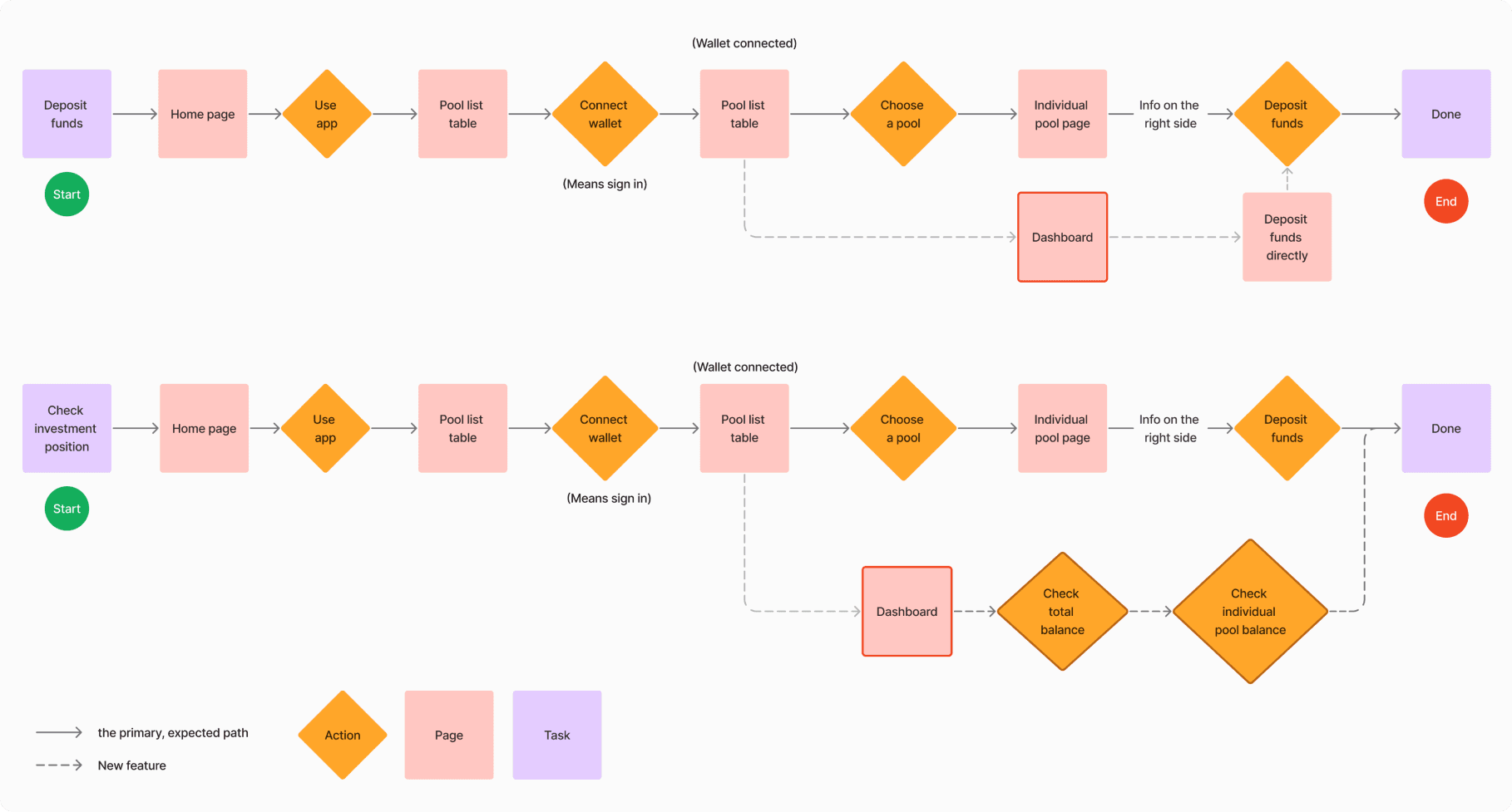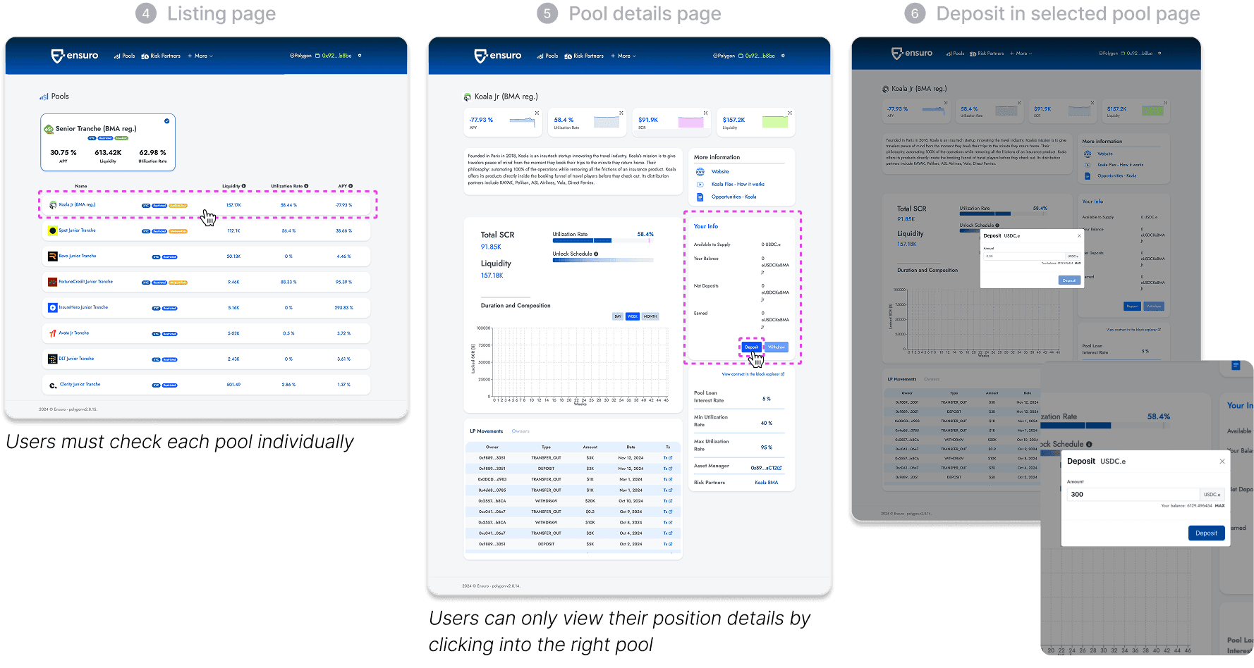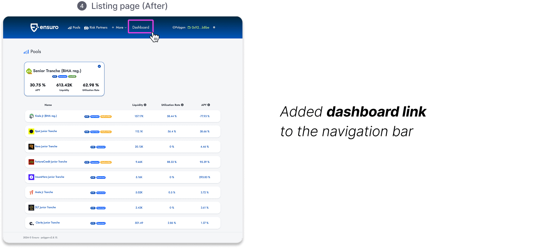 The original flow is functional, but adding a dashboard reduces user friction. The new dashboard enables users to view all invested pools and directly access deposit functions, eliminating the need to navigate back to the pool list or individual pool pages.